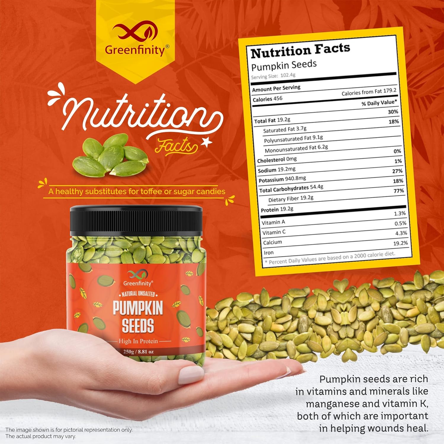 GreenFinity Fresh Raw Pumpkin Seeds (Pack of 2 x 250g) Elevate your healthy eating routine with GreenFinity's Fresh Raw Pumpkin Seeds. This pack contains two 250-gram pouches of high-quality, raw pumpkin seeds. Health Benefits & Key Highlights: