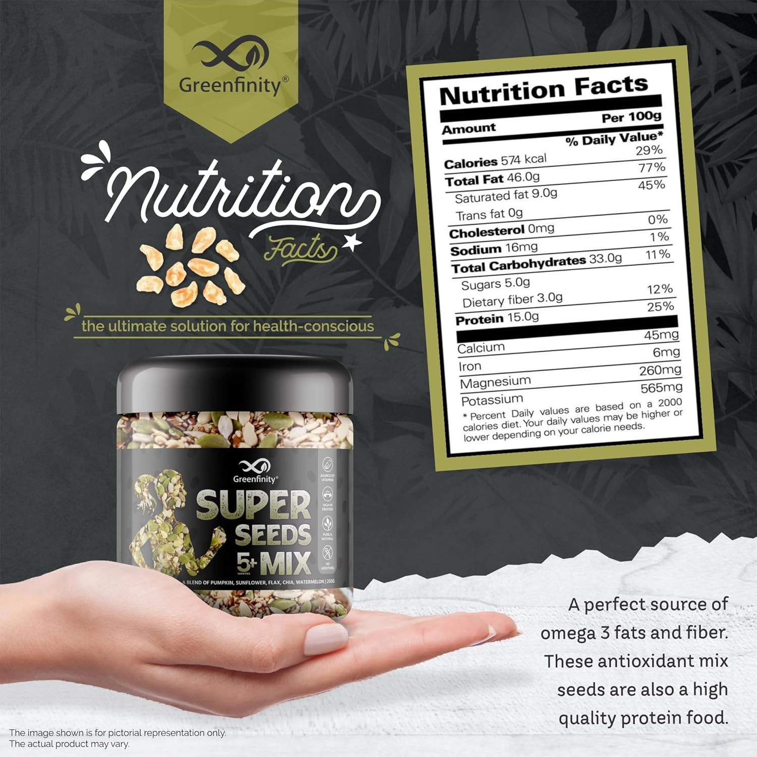 Unlock the power of nature with GreenFinity's Healthy Raw Mix Seeds. Crafted for the modern wellness journey, this premium blend combines five nutrient-dense seeds into a convenient, delicious superfood. Ideal for conscious snacking, this mix delivers a concentrated dose of everything your body needs to thrive—from essential Omega-3s for the brain to vital fiber for the gut. Nourish your body with GreenFinity, where quality meets purity.