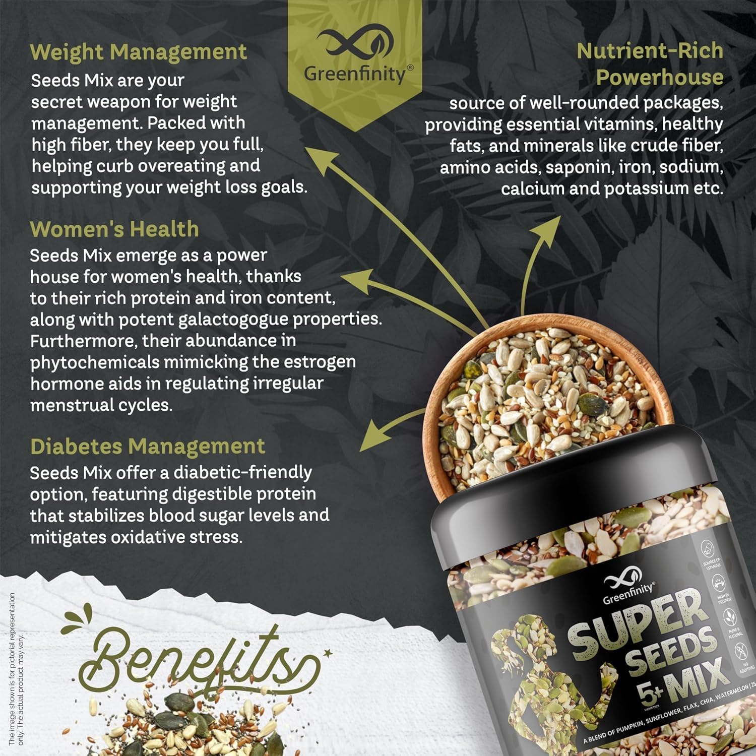 Whether you are focused on **weight management**, improving digestion, or simply boosting your daily vitamin intake, GreenFinity Raw Seeds Mix is your perfect companion. Unlike roasted or salted options, our raw and unprocessed blend retains maximum nutritional integrity. This is the ultimate, clean **immunity booster** snack, perfect for integrating into your salads, yogurts, smoothies, and baking recipes.
