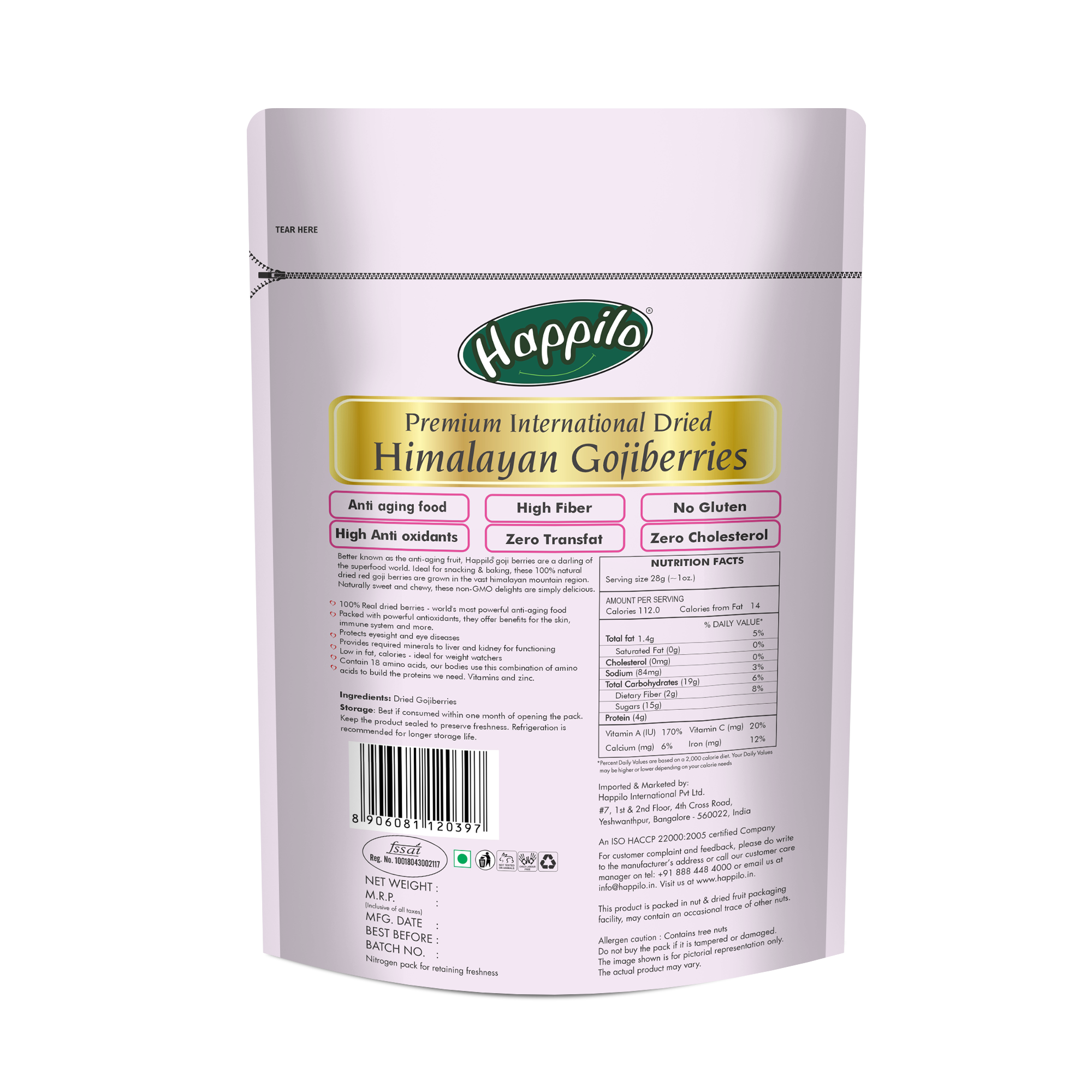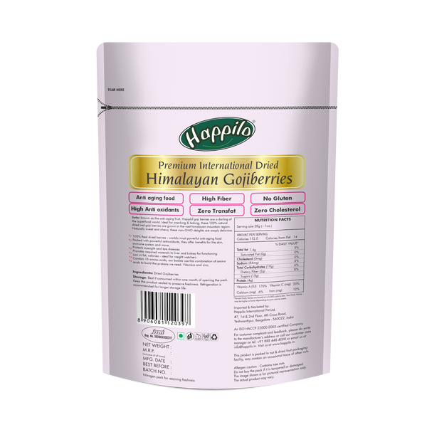 1. Happilo's Goji Berries contain many nutrients including dietary fiber, protein, antioxidants and many other essential vitamins and minerals. Additionally, these power packed berries are super low calorie and incredibly delicious.